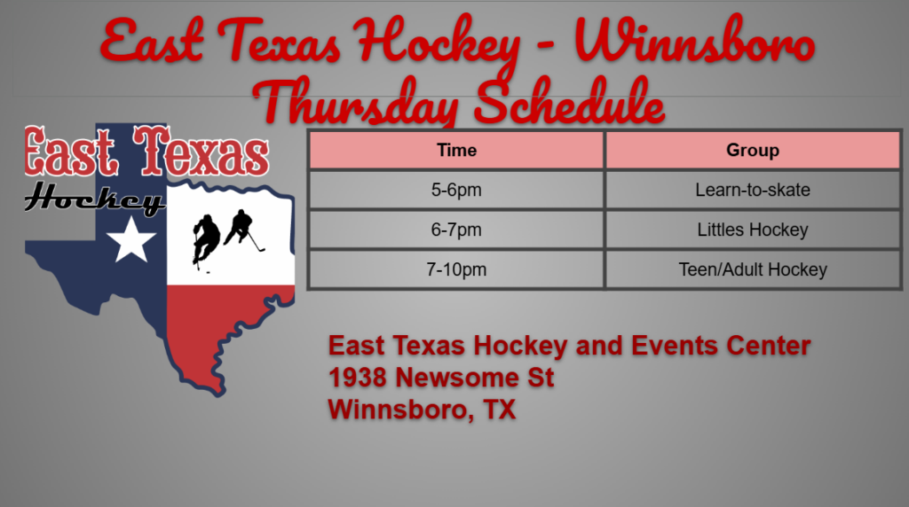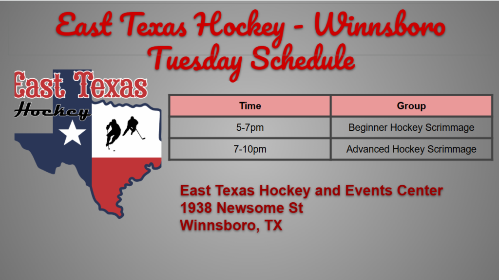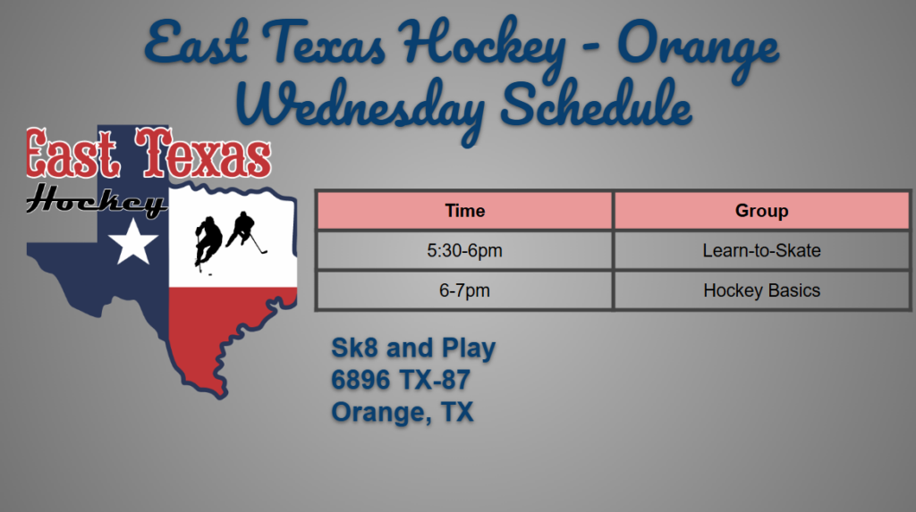 East Texas Hockey does not have a season. We are year-round. Feel free to drop in to any of the practices or come to them all!